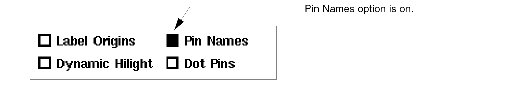 - To temporarily turn on Pin Names display, use the Display Options form in a layout window and then apply the changes, but do not save them.