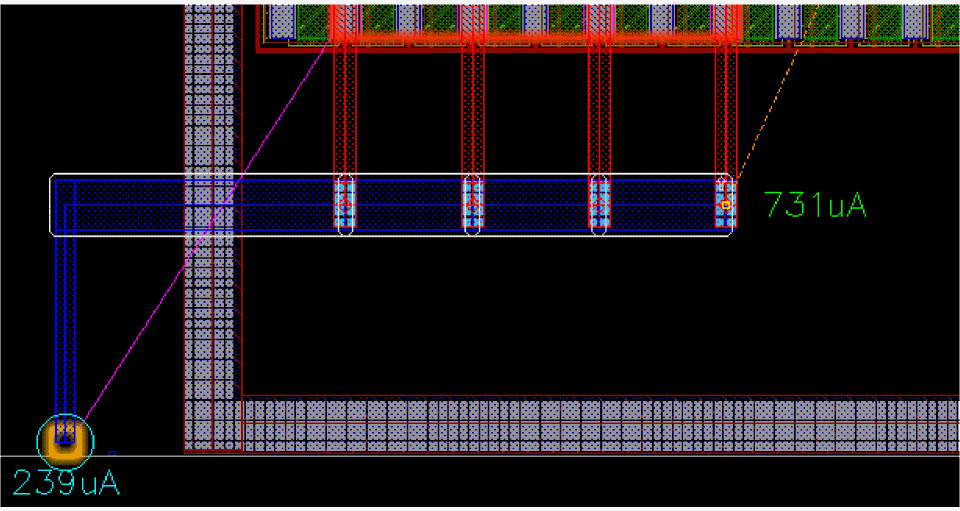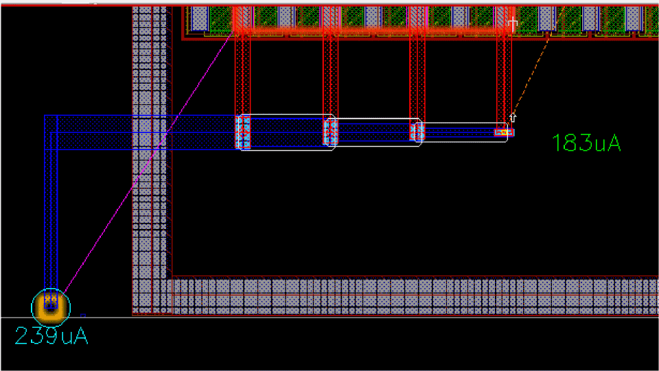 When tapering is enabled, the width of each segment is independently adjusted to match the estimated current value. The following figure shows how a wire width is adjusted when tapering is enabled.