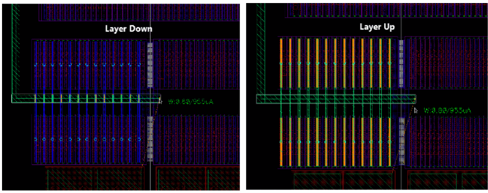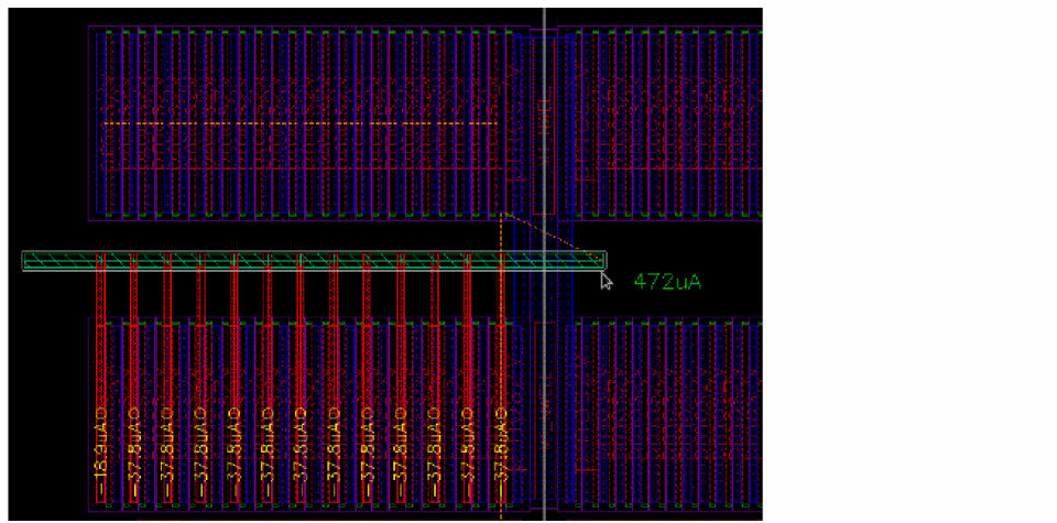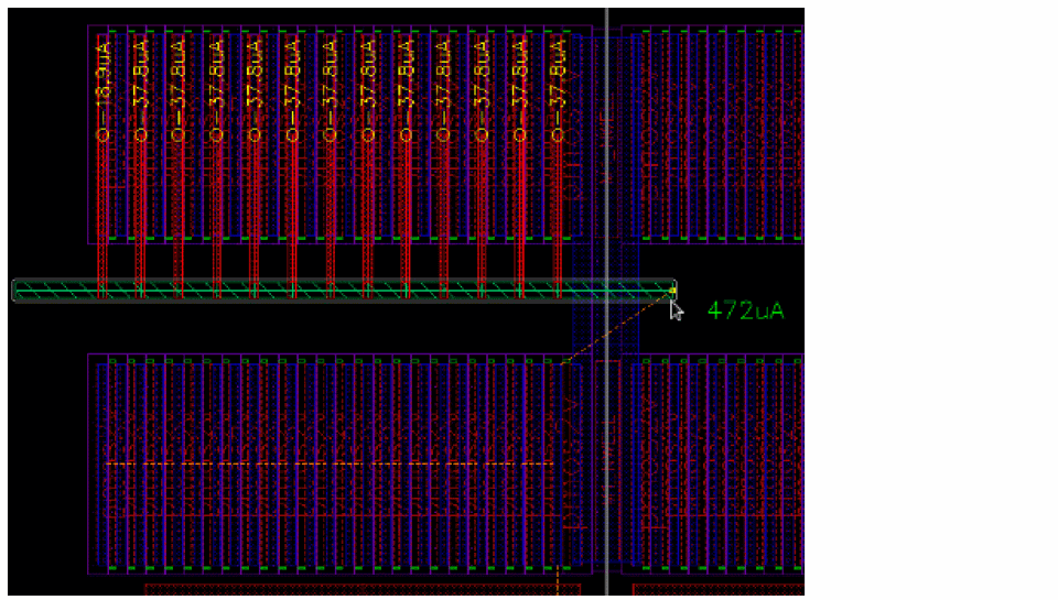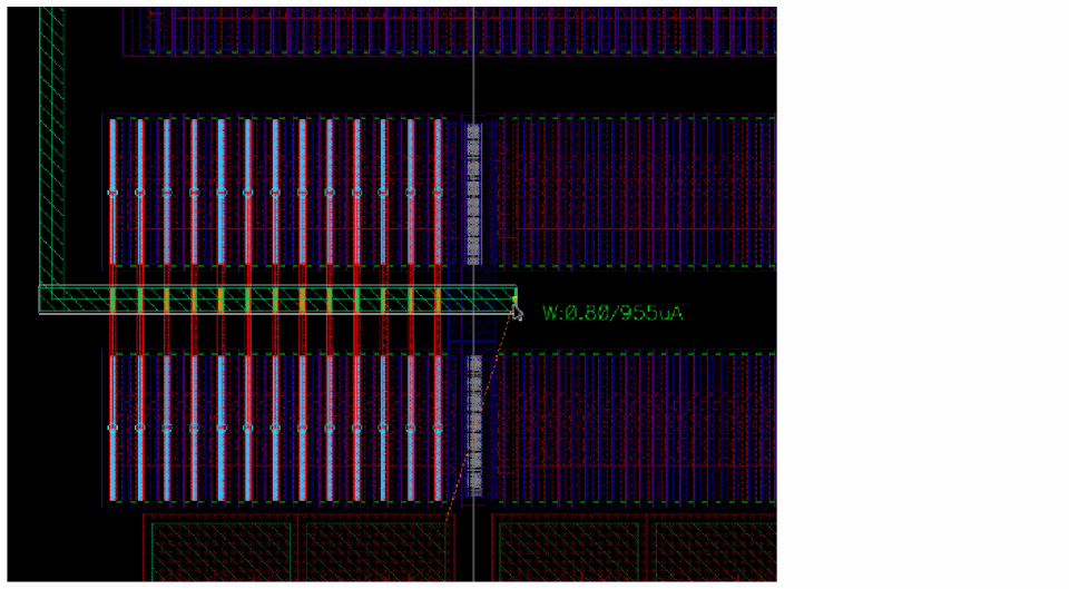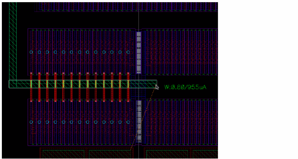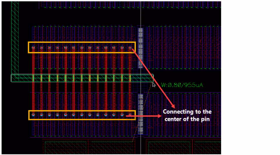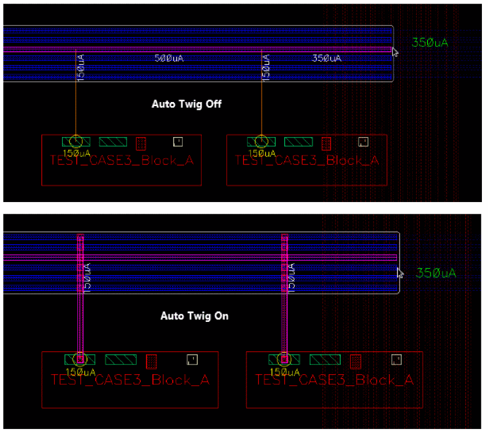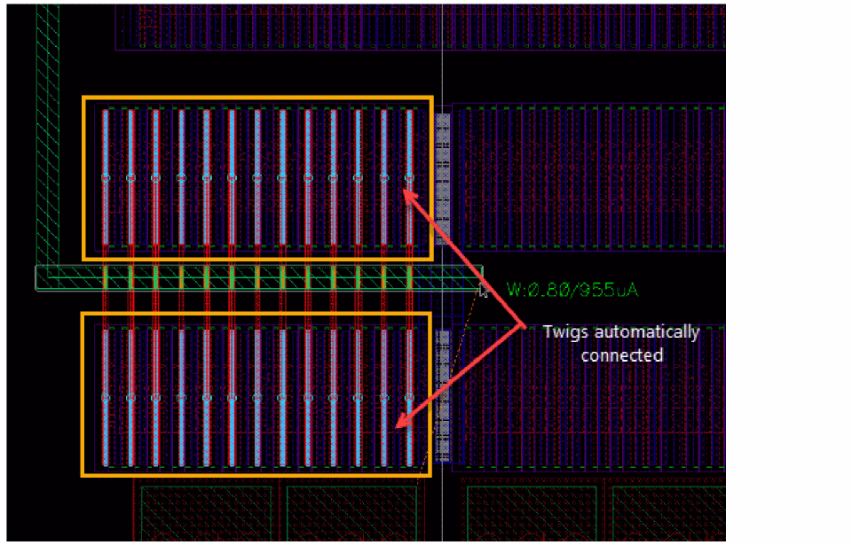 In interactive SDR, you can identify the device pins (target pins identified by the flightlines) and automatically connect multiple pins with the appropriate wires and vias. The twig (wires from the device to the main wire) layer is automatically defined but can be changed. The automatic twigs connection is independent of the current estimation mode and the checker modes. Also, the number of cuts in the vias and the width of the twigs are automatically adjusted.