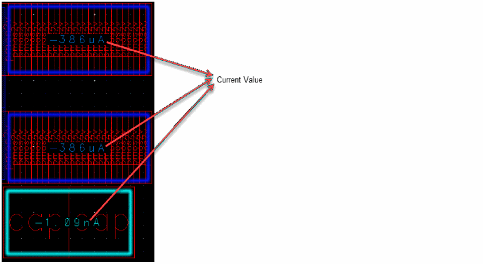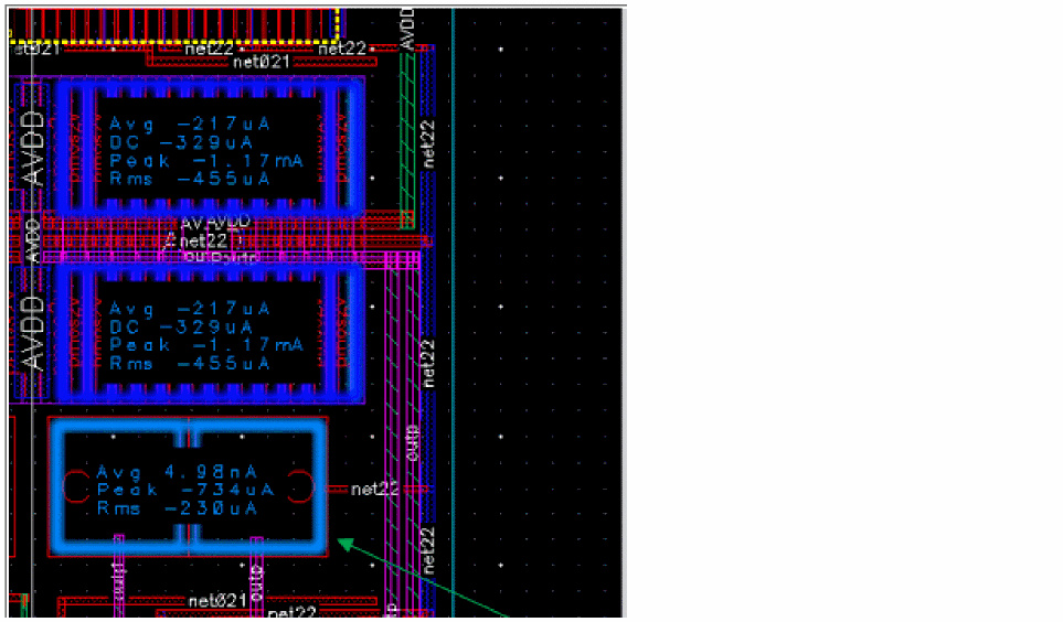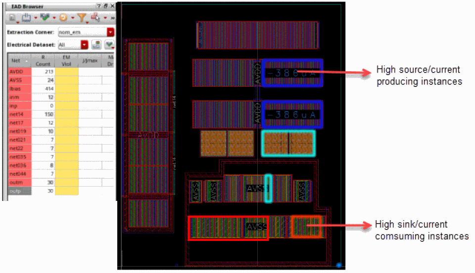 The layout canvas displays the group of abutted instances of theoutpnet. The colored halo around the grouped instances indicates whether it is a current consumer or a producer. The pins or instance pins producing the current are shown with a blue halo, and the sinks, pins, or instance pins consuming the current are shown with a red halo. The dark blue and dark red indicate higher current, whereas, lighter colors indicate a lower current.