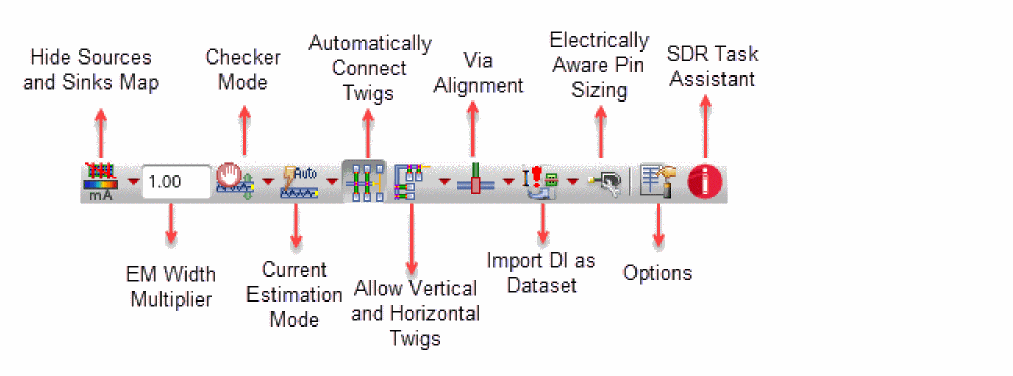 The SDR toolbar is designed to help you with the various simulation driven interactive routing features and settings. The SDR toolbar is installed automatically when you launch Layout EXL from the layout or schematic view. In case it is not available by default in Layout EXL, you can open it using Windows – Toolbars – SDR Toolbar. The buttons on the SDR Toolbar let you access SDR features with a single click.