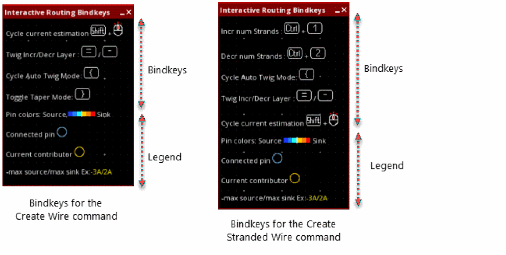 When you start the Create Wire command or the Create Stranded Wire command, the Interactive Routing Bindkeys info balloon is displayed at the top-left corner of the layout canvas. This info balloon shows specific bindkeys related to SDR and a legend to understand the visuals that get displayed in the layout canvas during simulation driven routing.