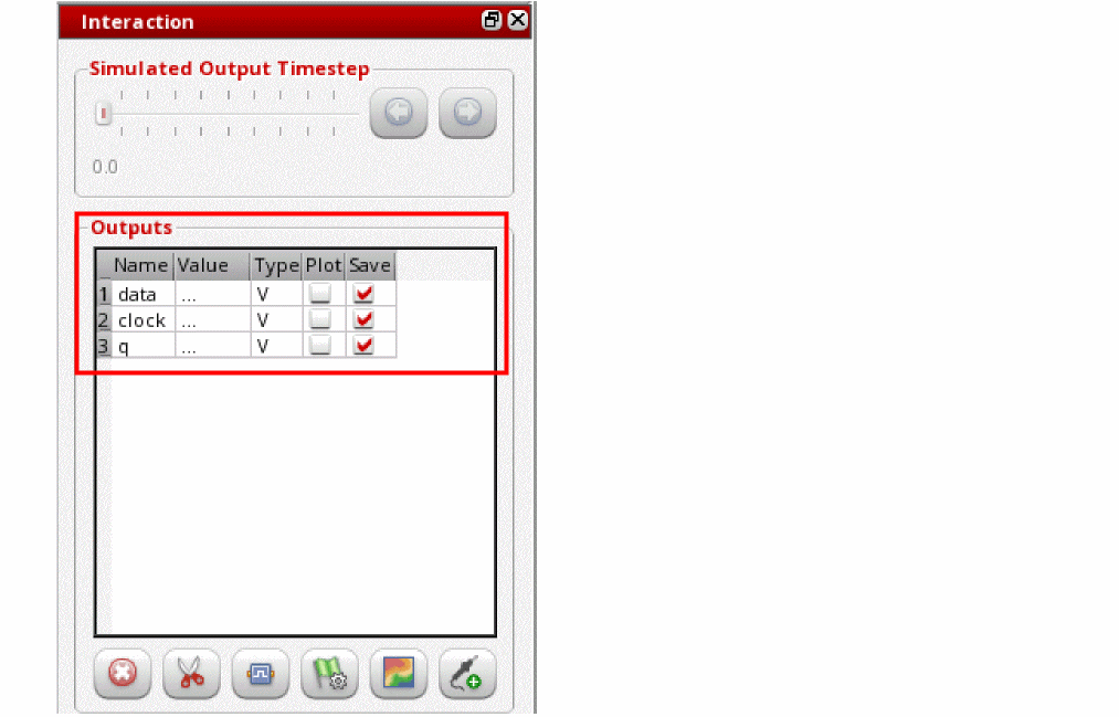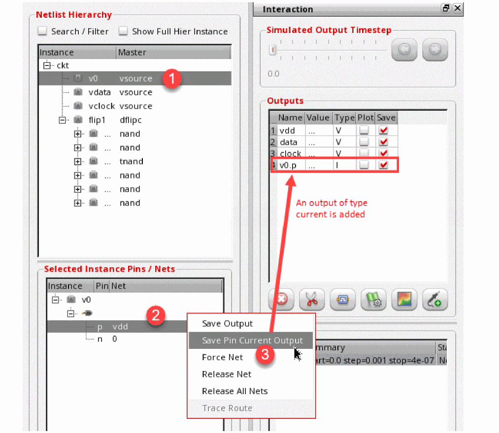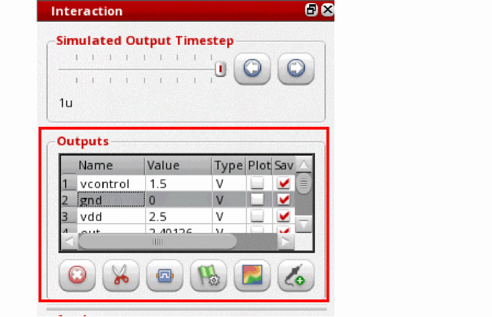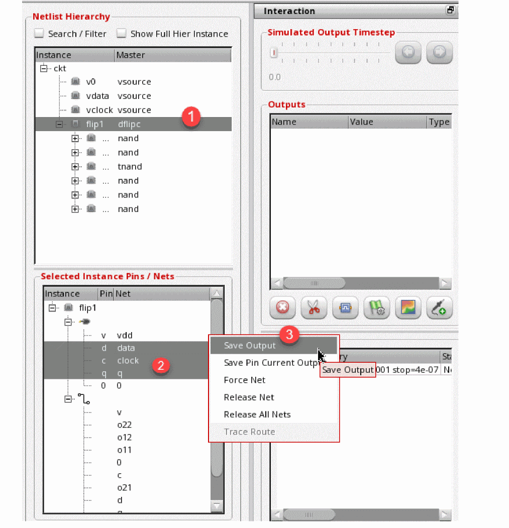 When running Spectre Interactive Environment from the command prompt in a new setup, you need to select the outputs to be saved while running a debug simulation.