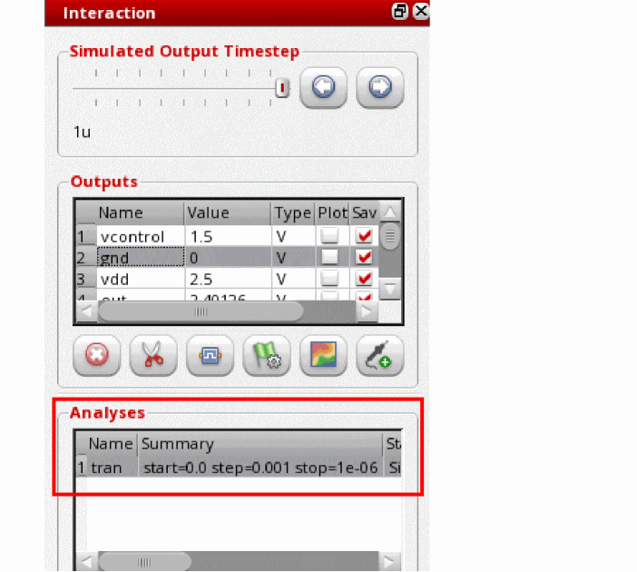 The details of the transient analyses extracted from the netlist are also displayed in the Analyses section of the Interaction assistant.