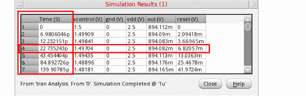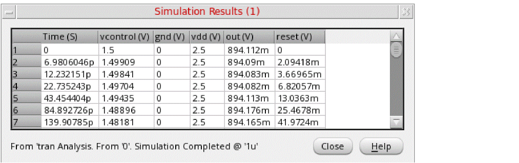 The Simulation Results table shows the results of the simulation run at each time step of the transient analysis, as shown below.