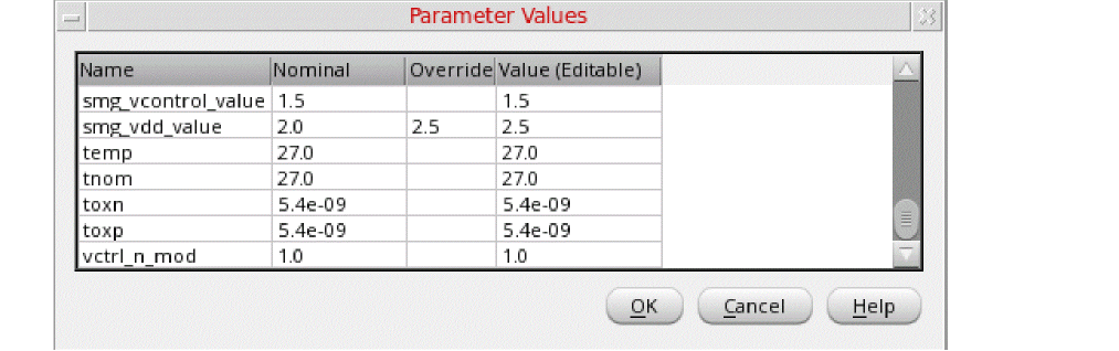 For all points except the first point, an additional column, Override (not shown in the figure), is also displayed on the Parameter Values form. The values of variables in the first point are considered as base values. Any parameter value modified for other points is considered as an overridden value and displayed in the Override column. For more details, refer to Editing Subcircuit Parameters.