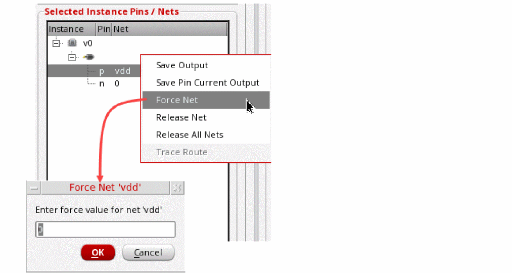If you do not select any net in the Selected Instance Pins/Nets section, Spectre Interactive Environment displays a message to confirm whether you want to release the forced values from all nets. If you click Yes, an action is created for that, as shown below.