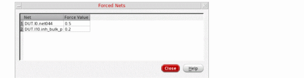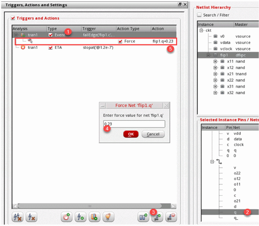 in the Triggers, Actions and Settings assistant. The Force Net form is displayed. Add a value that you want to force on the net and click OK. A force action is added for the selected event, as shown below.
