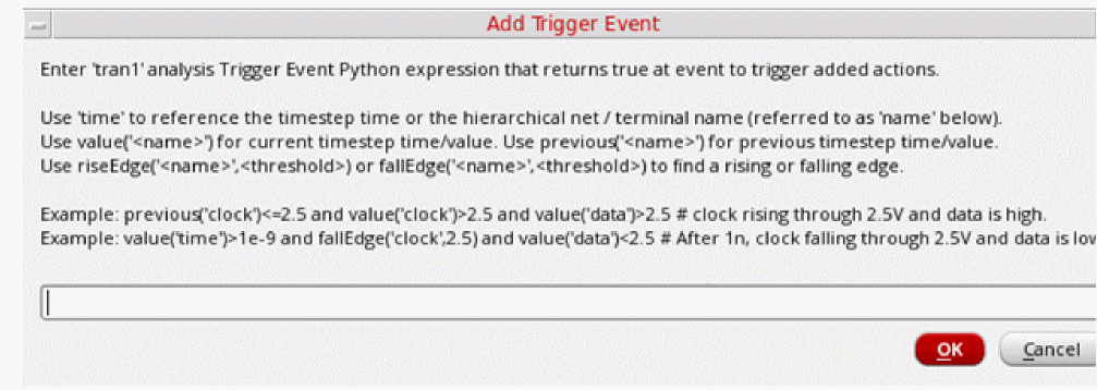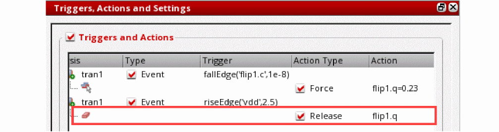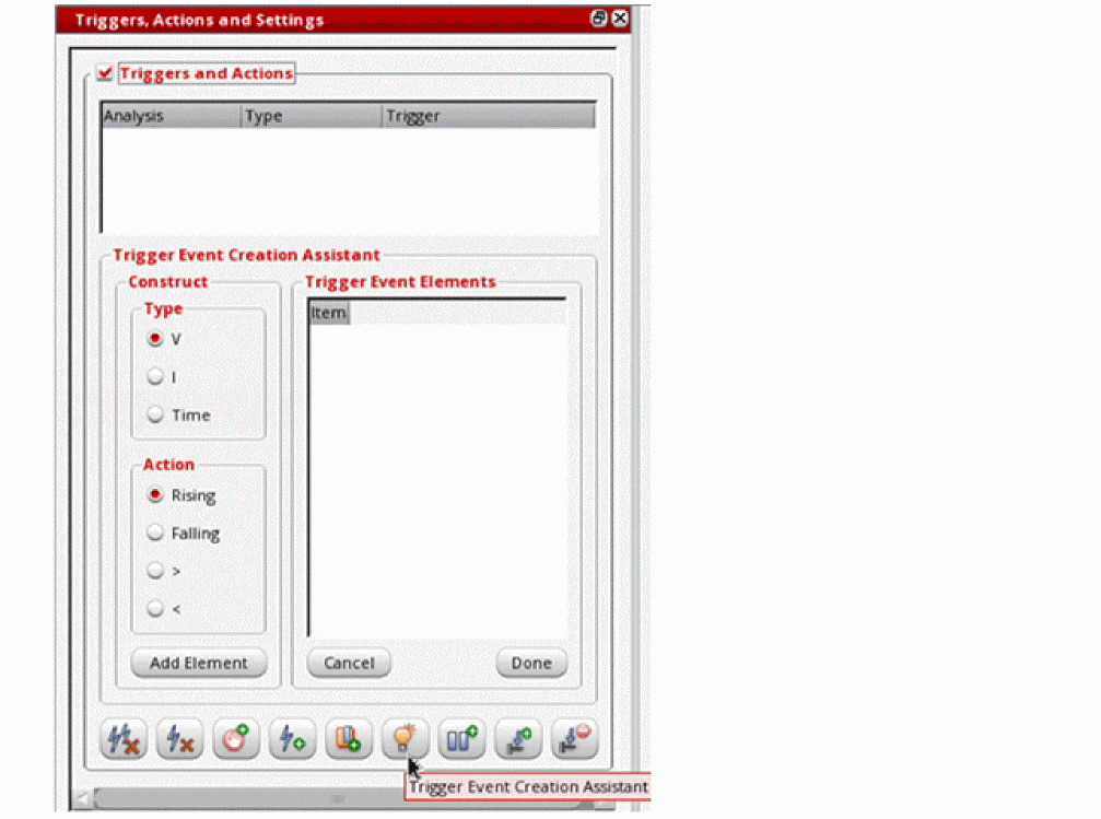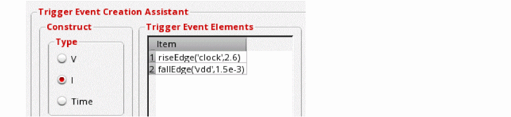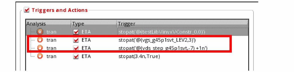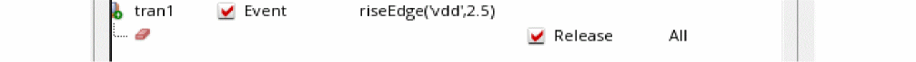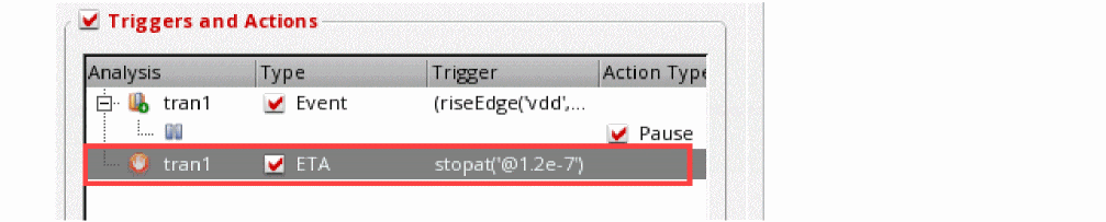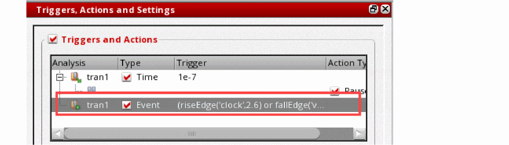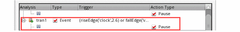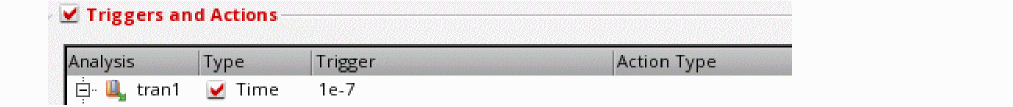 In this row, the left most column shows the name of the transient analysis for which this trigger is applicable. The Type column is set to