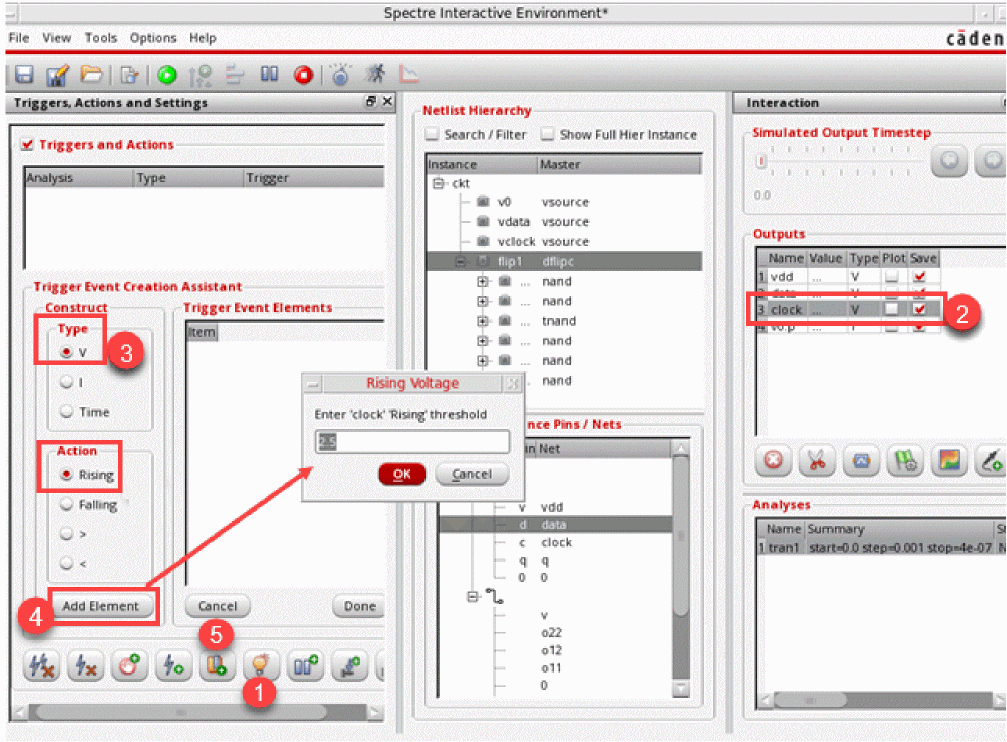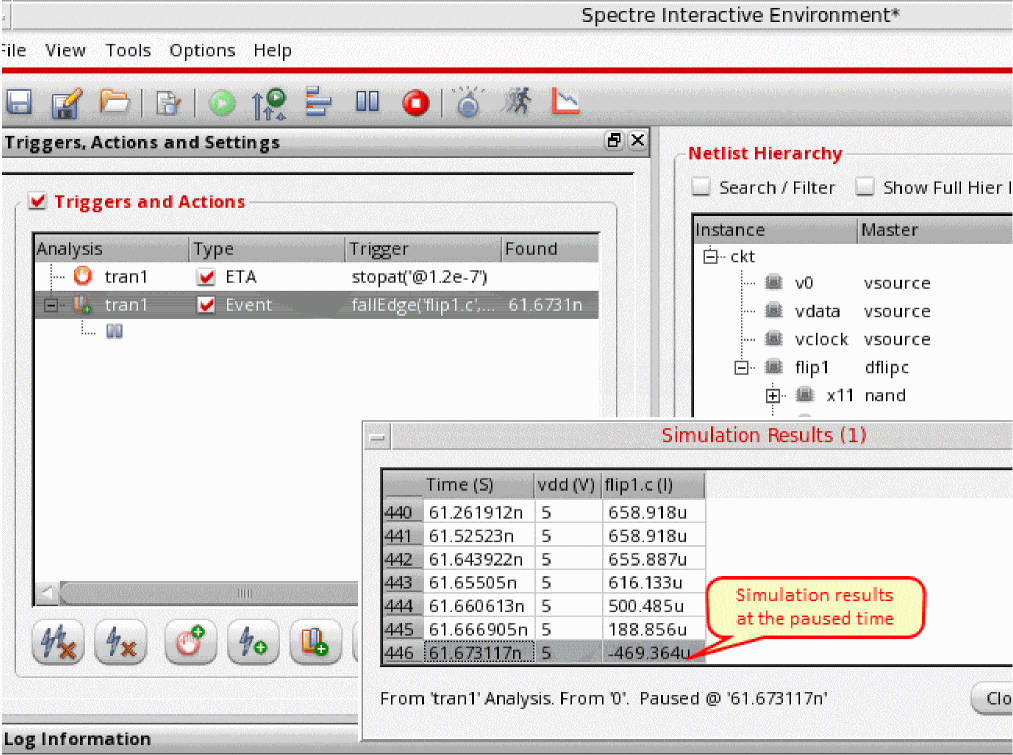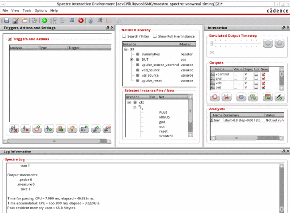 To facilitate debugging, Spectre Interactive Environment provides various features, such as breakpoints and triggers, that you can use to pause the simulation at any specific point where you need to monitor the value of nets or terminals. You can access circuit instances and connections, and modify their parameters at different events to measure the outputs. These features help you perform a detailed analysis to identify the exact nodes where you can modify the design to improve performance.