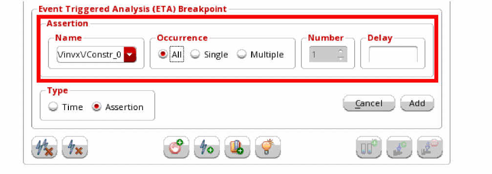 - Single: Adds a breakpoint at the first occurrence of the assertion during the simulation run.