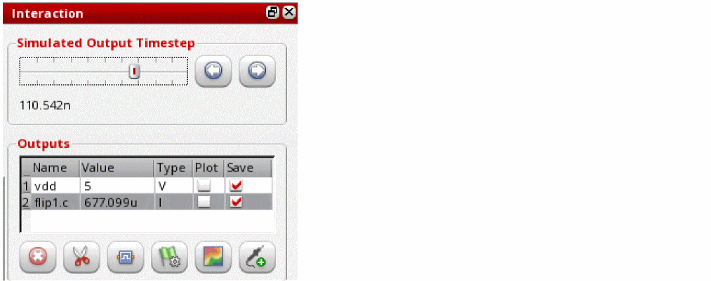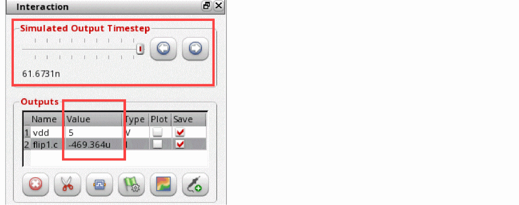 The timesteps are indicated on the Simulated Output Timestep progress bar in the Interaction assistant. Values of the outputs at a timestep are displayed in the Value column of the Outputs table.