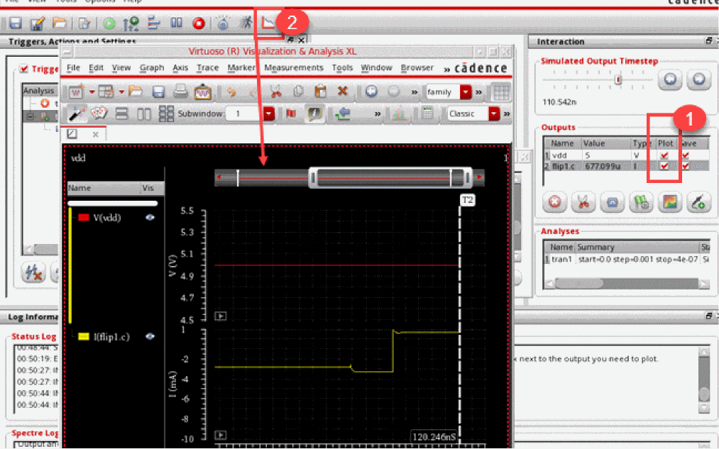 on the toolbar and plot the results of the current simulation run in Spectre Interactive Environment in the Virtuoso Visualization and Analysis XL window.