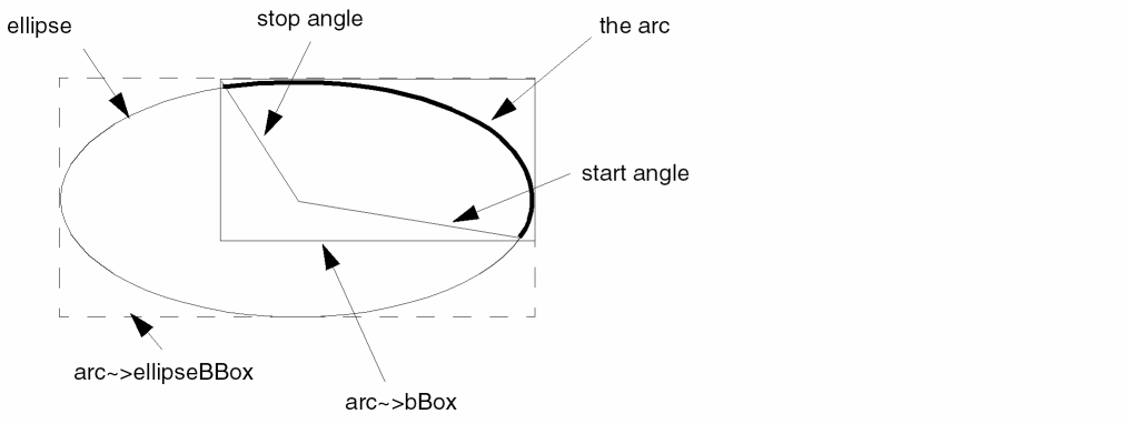 The sweep of the arc begins at startAngle and proceeds counterclockwise until it ends at stopAngle. The sweep must be no more than pi (180 degrees). arc~>bBox defines the bounding box of just the arc, whereas arc~>ellipseBBox defines the bounding box of the entire ellipse that has the arc as a piece of it.