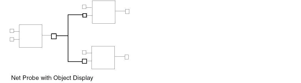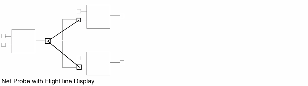 The net probe draws a user-specified net. There are two display modes associated with net probes. The flight lines of the net can be displayed so that a spanning tree contains all the terminals in the net. The other display mode is to display the objects in this net.