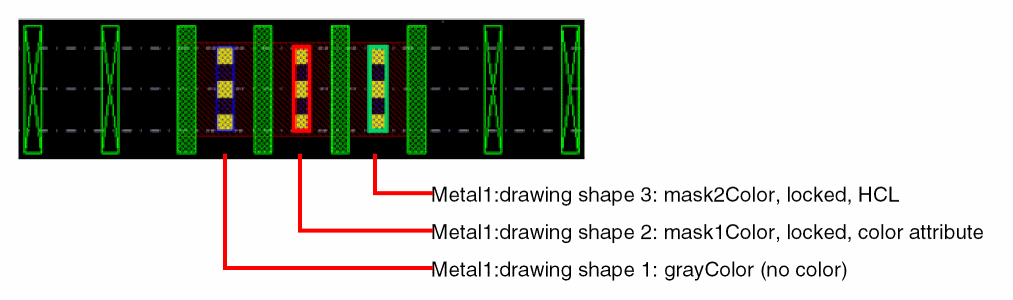 Returns the list of Metal1:drawing shapes in the selected Pcell along with the information for each shape about its color, locked state, and whether the color is due to color attribute or hierarchical color locking (HCL). In the figure below, three shapes are reported. The first shape is not colored, the second is locked on mask1Color but not due to HCL, and the third is locked on mask2Color due to HCL.