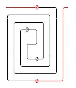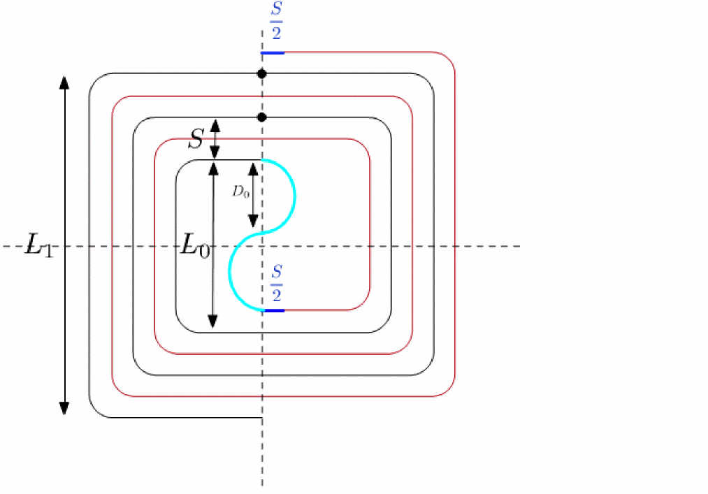 (Virtuoso Photonics Option) Creates a spiral connector that consists of an inner S-shaped figure of two joined circular bend connectors. Each endpoint of S is prolonged by a straight extension and then by N-turnings of a spiral circling around S.