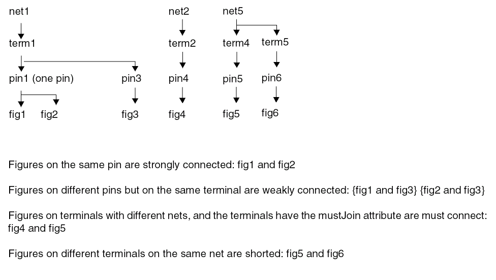 A terminal (Term) represents a logical connection. A Pin represents the physical implementation of a logical connection. A terminal may have one or more Pins. A pinFig represents a specific connection point in the implementation of the Pin. Typically, pinFigs are shapes, but they can also be other geometrical objects (such as instances). In the rest of the section, we will use the term pinFigs and shapes interchangeably for simplicity.