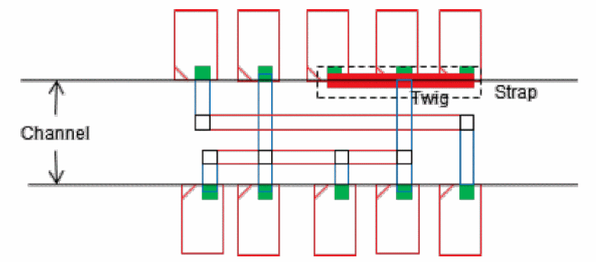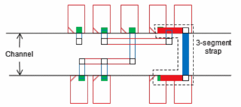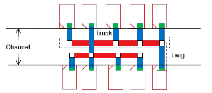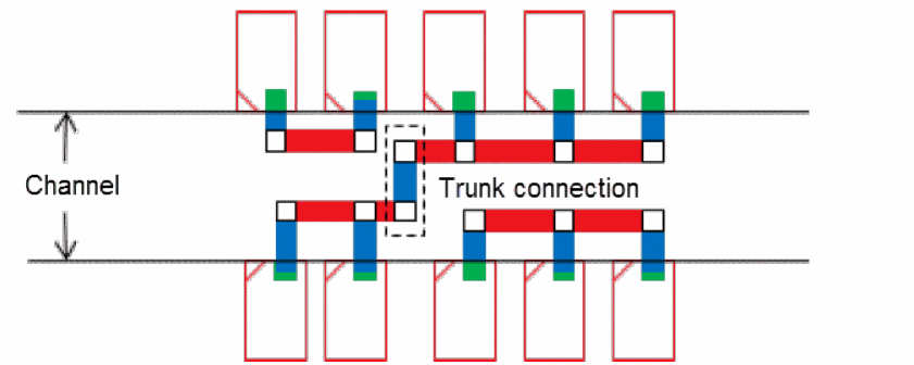 An interconnect connection between instTerms that runs perpendicular to a channel and connects trunks to a different instTerm.