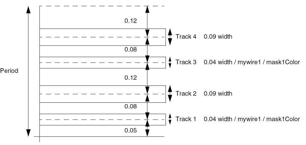 In this example, a width spacing pattern wsp1 is created in the cellview cv with two track groups, defining a total of six tracks.