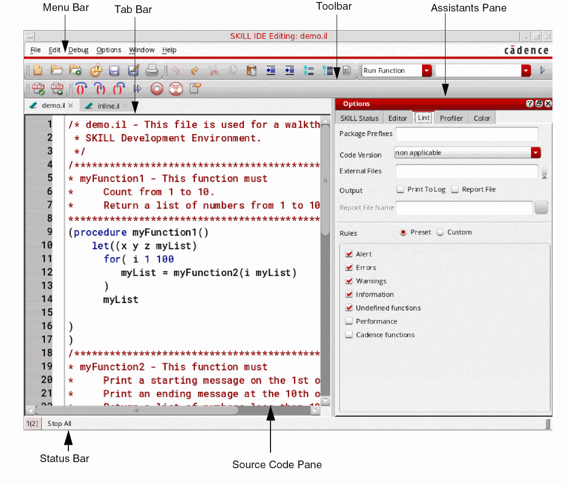 The SKILL IDE interface is user-friendly and intuitive. It consists of menus, toolbars, dialog boxes, and windows that help you control your debugging operations. Therefore, you no longer need to learn complex debugging commands.