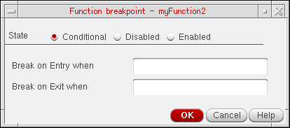 If you do not specify a valid entry or exit criteria in the Function breakpoint dialog box, a warning message displays in the CIW, indicating an incomplete breakpoint criteria. Specify the criteria again.