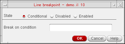 - Select an appropriate breakpoint state. The available options are: Conditional, Disabled, and Enabled.