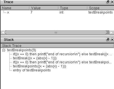 To see how the scope of a variable changes with respect to the function currently being executed, set the entry and exit condition for both the functions (testBreakpoints() and testBreak()) to t. Call testBreakpoints() with the value 9 and then trace the variable x.