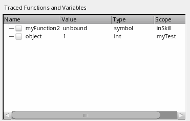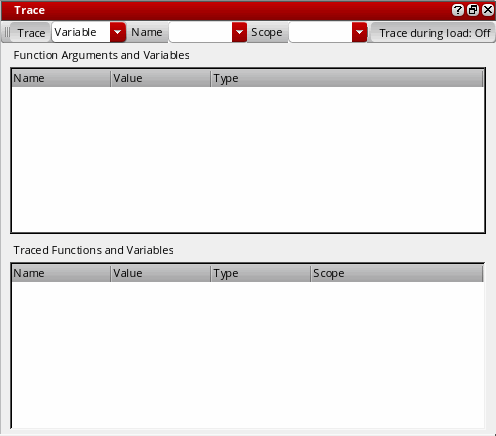 Select Variable or Function from the Trace drop-down list box and then, specify the name of the variable or function to be traced in the Name drop-down list box. If you are tracing a variable, you can specify the scope of the traced variable in the Scope drop-down list box.