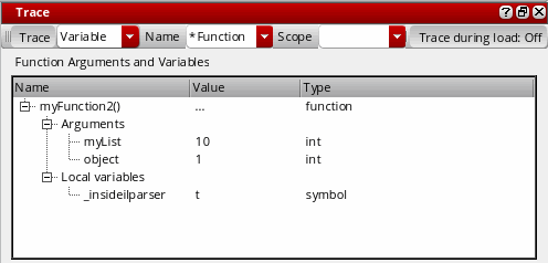 Execute a function in your code. The Function Arguments and Variables section of the Trace assistant window gets updated with the name of the function on top of the call stack, along with its arguments, local variables, and their values.