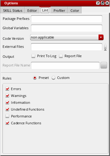 If you click Preset, select one or more of the following check boxes to specify the message groups you want SKILL Lint to report: Errors, Warnings, Information, Undefined functions, Performance, and Cadence Functions.