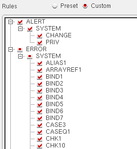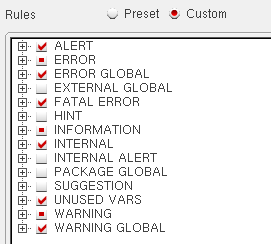 If you click Custom, a hierarchical tree of the available types of error reporting mechanisms displays in the area within the Rules section. Select the check boxes adjacent to the different classes of messages you want SKILL Lint to report.