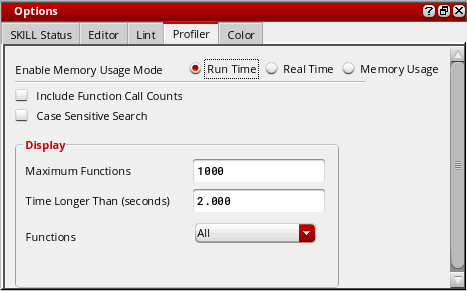 After you have finished running the Profiler on your SKILL code, the fields in the Display area become enabled as shown in the following figure. These fields let you set the display properties for viewing the collected data.