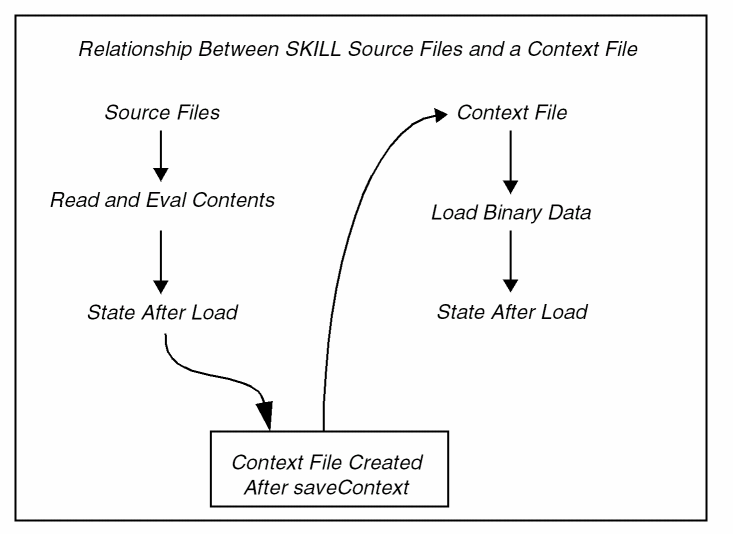 When a SKILL source file is loaded, it is first parsed. The evaluator is called for each complete expression read in. This is how procedures are defined. Context files, on the other hand, contain binary data that is loaded directly into memory. The binary data stored into a context has been parsed and evaluated before being saved.