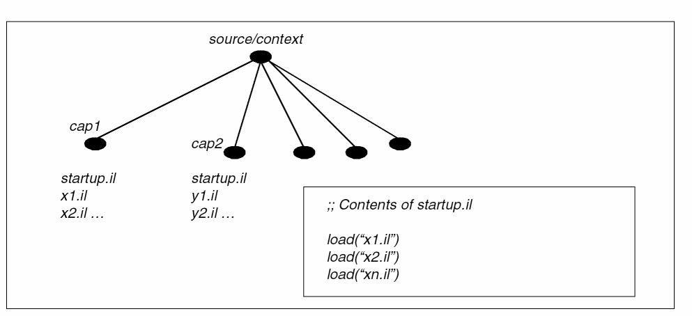 For each capability context directory, create a single file named startup.il that uses the SKILL load command to load all the files in that directory in the necessary order. The figure below shows a layout of the context directories. To evaluate a command at the top level, use the loadTopContextForm command instead of load.