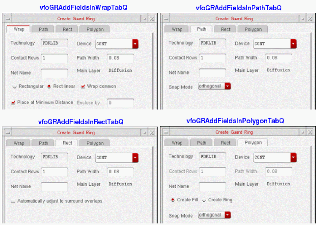 In the Create Guard Ring form, there are multiple global lists that enable you to add various form components. The common global list (also called common queue) defines the set of form components that are displayed on all four tabs (Wrap, Path, Rect, and Polygon) of this form. For example, the GUI components, such as Technology, Device, and Contact Rows, that are common on all tabs (as shown in the images below) exist in the common queue area. If you add a new component in this area, it will be displayed on all the tabs.