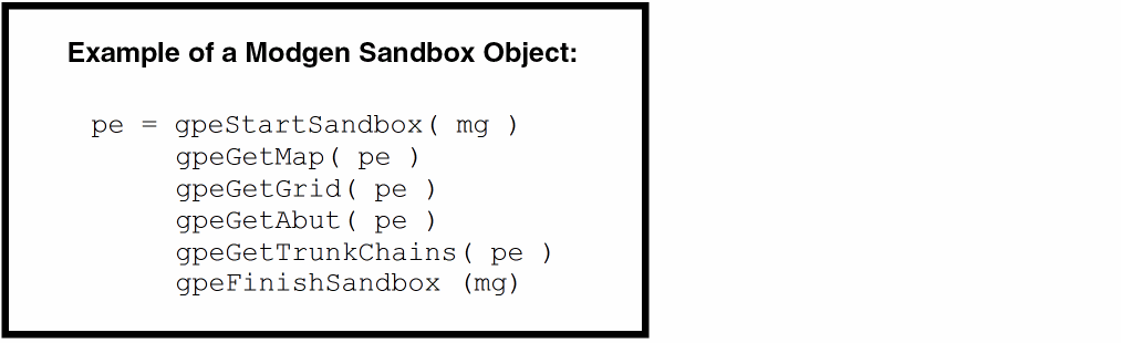 There are four main sections in a Modgen sandbox object: map, grid, abut, and topology. Each section contains properties and additional disembodied property lists (DPLs) that hold information about the Modgen.