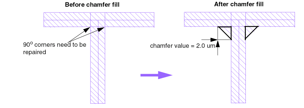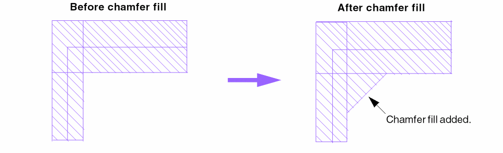 Creates chamfer fill on wires (pathSegs). The chamfer fill mechanism removes 90-degree corners by filling the corners of wires that form T-junctions, L-shaped wires, wire-to-via, wire-to-rectangle, and wire-to-polygon connections. T-junctions and L shapes created using only rectangles or polygons are not considered for chamfer fill.