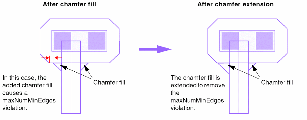 If the added chamfer fill at a via junction causes a maxNumMinEdges violation, then the chamfer fill edges are extended to fix the violation, as shown in the following figure.