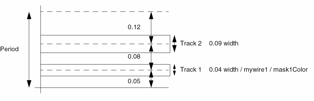 In this example, a width spacing pattern wsp1 is created in the technology database tech with two track groups, defining a total of six tracks.