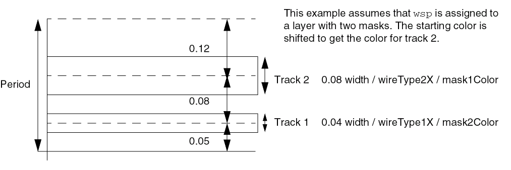 Creates the wsp width spacing pattern with two tracks in the specified technology file, as shown in the following figure. allowedRepeatMode is steppedOnly, which implies that the pattern can only be stepped, but not flipped. In conformance, defaultRepeatMode is stepped.