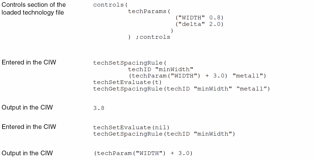 In the following example, techGetSpacingRule returns the value of the control parameter when techSetEvaluate is set to t. After setting the evaluation flag to nil, techGetSpacingRule returns the unevaluated value for the minWidth spacing rule.