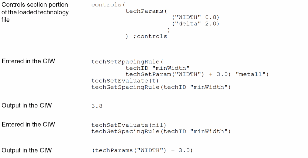 The techParams control lets you set parameters that you can use in the other technology file sections. The function techSetEvaluate lets you specify whether or not to evaluate parameters when you use techGet functions or dump the technology file. By default, no evaluation is done.