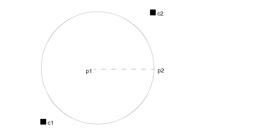 The initProc forces the window current layer and purpose pair to be (“pdiff” “drawing”). When you enter point p1 the prompt changes to Enter a point on the circumference. A rubberband circle appears with center p1 and passing through the cursor. Enter point p2 and doneProc prints the circle points: