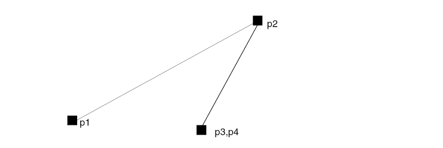 Enter point p2 and the first segment becomes permanent, while the rubberbanding line now attaches the cursor to p2. Continue with p3. Enter p4 at the same location as p3. doneProc prints the following point list: