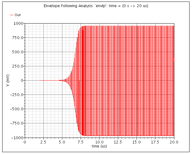 tstabvalue. The default value oftstabfor an autonomous envelope analysis is 4 cycles of the fundamental, which might not be enough to ensure convergence. During an HB Envelope analysis, especially for high-Q designs, enoughtstabis needed to ensure that the oscillation starts. -