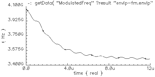 After the autonomous ENVLP analysis, you can plot the time-varying instantaneous frequency. For example, applying a 1 MHz sinusoidal source on the control voltage of a 3.46 GHz VCO circuit and then displaying the instantaneous frequency produces the plot shown in Figure 2-32. The ripple on the curve indicates that the VCO frequency follows the 1 MHz modulation signal. This circuit cannot be analyzed using either autonomous PSS or non-autonomous ENVLP analysis. The transient analysis can be used but it is very time consuming as discussed in the previous example.