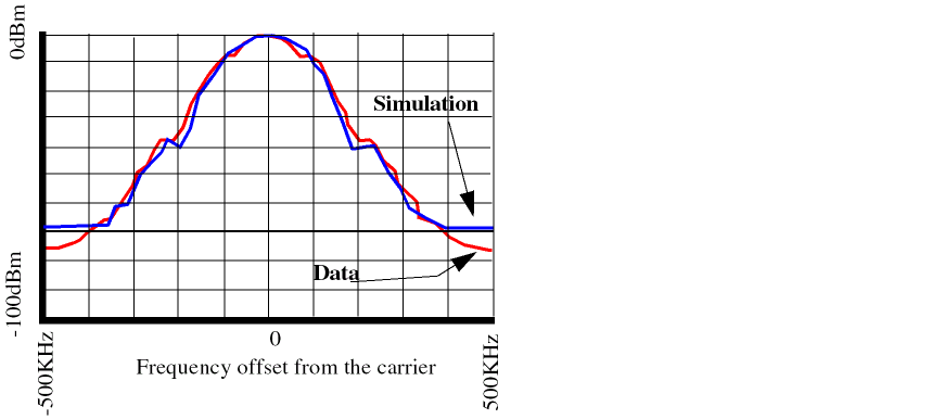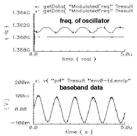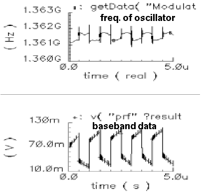 The simulation results are plotted in Figure 2-37. The upper plot is the instantaneous frequency from the VCO output. The lower plot is the baseband data signal. The figure shows that the oscillating frequency is affected by the power amplifier.