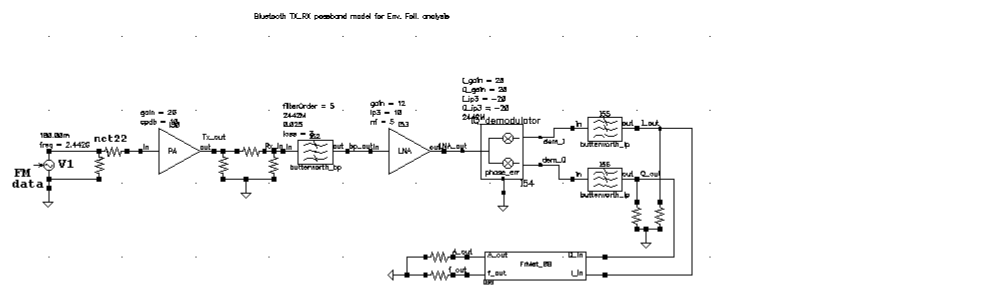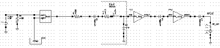 The following schematic, shown in Figure 2-42, is a circuit that includes an FM source followed by a PA, an LNA, and several other receiver components that perform demodulation.