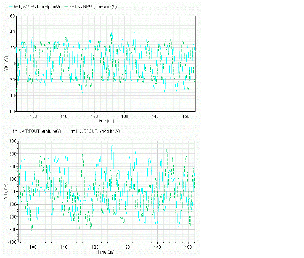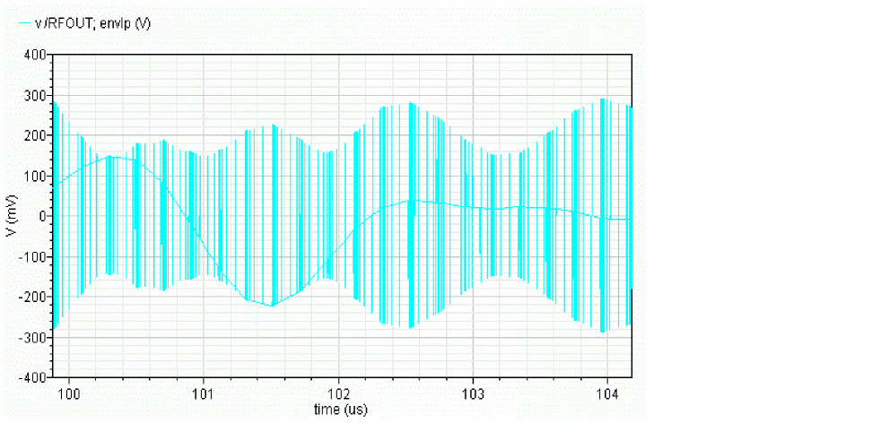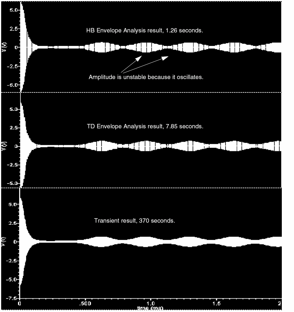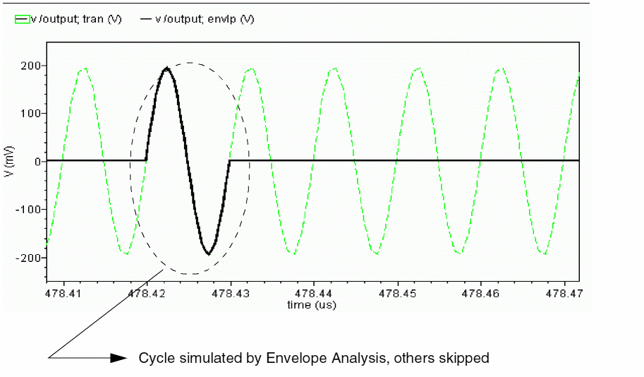 - Not efficient due to Newton iteration failures. The failures occurs because the polynomial condition is not satisfied. This can be seen in Figure 2-38 and Figure 2-39. Figure 2-38 indicates that standard envelope analysis is not working at all and the simulator is just doing a transient analysis.